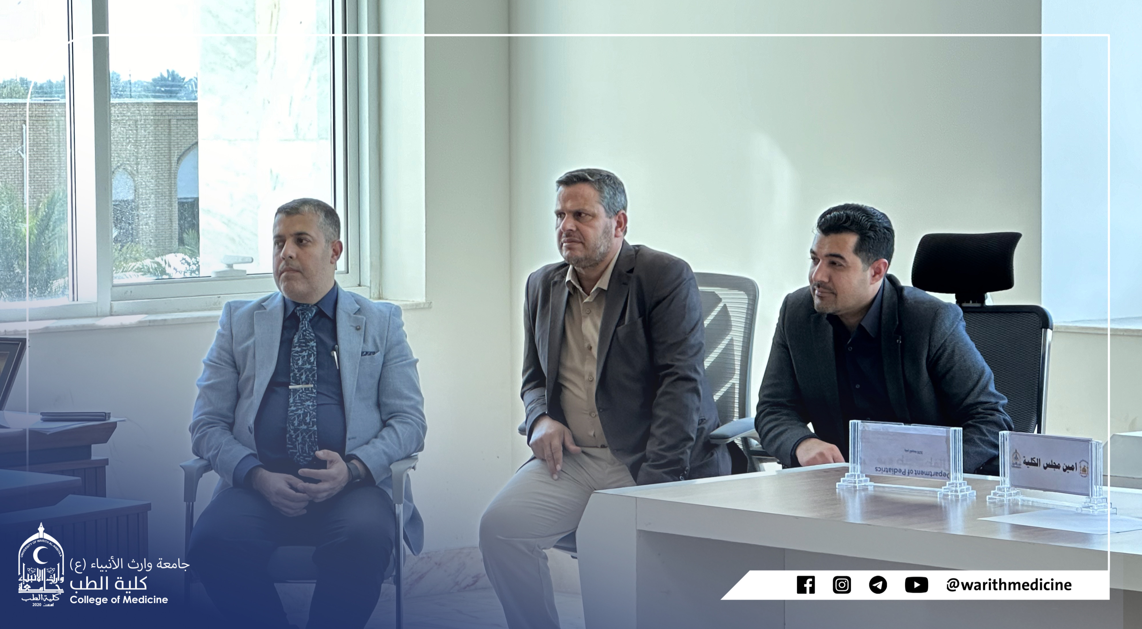 The Honorable Dean of the College of Medicine, Professor Dr. Ali Abd Saadoun Al-Ghazi, the Honorable Assistant Dean for Scientific Affairs, Lecturer Dr. Riyad Haniwa, the Honorable Assistant Dean for Administrative Affairs, Professor Dr. Ali Mansour, the Honorable Director of the Legal Affairs Division, Lecturer Dr. Sabah Al-Jubouri, and the Director of the Medical Education Unit, Lecturer Dr. Ahmed Abdel, met. Respected Muslim, the teaching assistants among the staff of the College of Medicine held the regular meeting to find out the latest developments regarding the work entrusted to them.