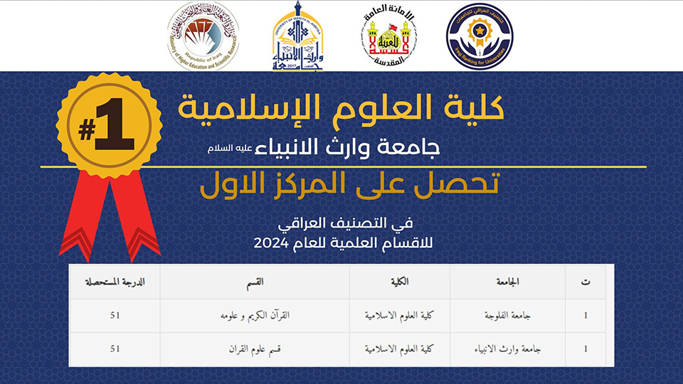 The Department of Quranic Sciences at the College of Islamic Sciences has achieved a remarkable academic milestone, securing first place in the Iraqi Academic Department Ranking announced by the Ministry of Higher Education and Scientific Research.