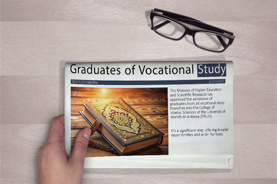 The Minister of Higher Education and Scientific Research has approved the admission of graduates from all vocational study branches into the College of Islamic Sciences at the University of Warith Al-Anbiyaa (PBUH) (Department of Qur’anic Sciences and Department of Jurisprudence and Its Foundations). Admission will be based on the grade averages to be announced soon in the Central Admission Guide for students.