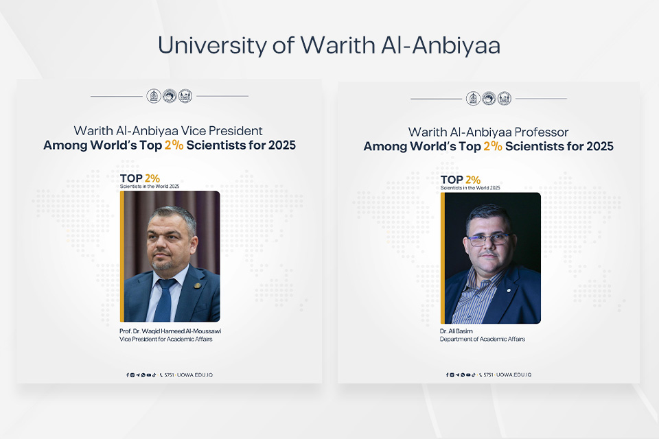 In a new academic achievement added to the record of successes at the University of Warith Al-Anbiyaa (PBUH), the names of Prof. Dr. Waqid Hameed Al-Moussawi, Vice President for Academic Affairs, along with Dr. Ali Basim, were included in the list of the world’s top 2% scientists for 2025, according to the annual study conducted by a research team at Stanford University, USA.